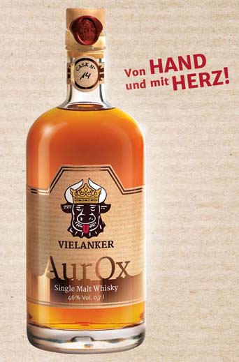 | | Der erste Whisky wurde im März 2008 gebrannt. Eingelagert am 29.04.2008 in ein Ex-Bourbon-Fass, lagert es seit dieser Zeit in unserer Schatzkammer. Die ersten 100 Flaschen aus dem Fass Nr.1 sind Ende Mai 2011 zur Präsentation am 10.06.2011 abgefüllt worden. Der Abend war ein voller Erfolg, da auch der Zuspruch und die positive Bewertung von einigen Whiskykennern die Anspannung abklingen ließen. Für einen Single Malt mit 3Jahren ist er mild mit einer wundervollen Malznote und deutlicher Vanille und man bescheinigte ihm gute Anlagen für die Zukunft. - Nicht kühlgefiltert - Ohne Farbstoff - Einzelfassabfüllung - Mit Flaschennummer und Signiert. In den Holzgriffkorken wird eine Nummer eingebrannt die sich wie folgt zusammensetzt. - W = Whisky - 02 = Fassnummer - 01 = Jeweilige Abfüllung aus dem Fass Da jedes Fass separat abgefüllt wird, fängt es auch immer mit der Flaschennummer 001 an. Diese steht dann auf dem Rückenetikett mit der Unterschrift des Leiters der Brennerei - Henry Schwerk. So kann jeder genau nachvollziehen welche Flasche aus welchem Fass er hat. Der Holzgriffkorken ist mit einem Siegel gesichert. Das Siegel ist das Wappentier, der Auerochse. | |